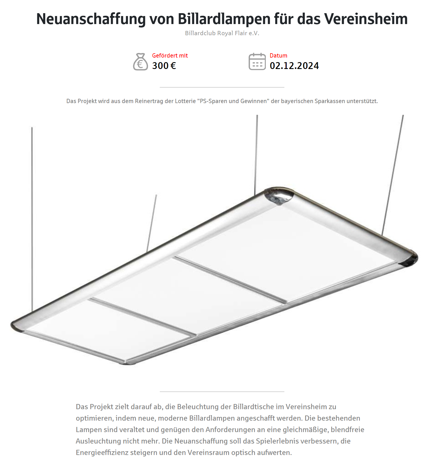 im Namen des Billardclubs Royal Flair e.V. möchten wir uns herzlich bei unserem Sponsor der Sparkasse Passau für die großzügige Spende von 300 Euro bedanken. Es ist uns eine Freude, die Sparkasse Passau als Sponsor unseres Projekts zur Anschaffung neuer Billardlampen an unserer Seite zu wissen.
